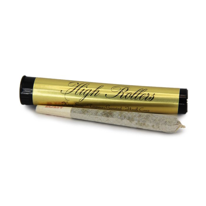 Hand-crafted, king size, terpene boosted raw cone stuffed with AAAA flower and 73 micron full melt bubble hash.
