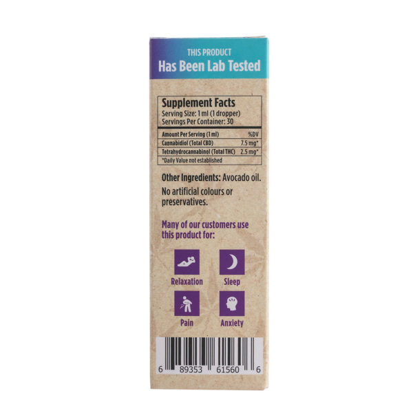 Dose: 75mg THC + 225mg CBD Indica (night time use)